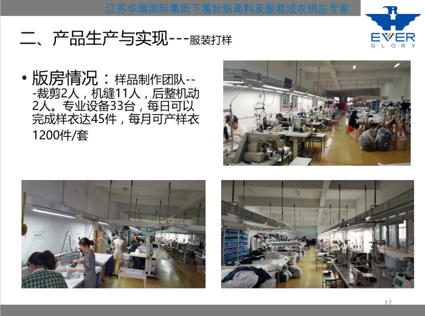 样品制作团队---裁剪2人,机缝11人,后整机动2人。专业设备33台,每日可以完成样衣达45件,每月可产样衣1200套