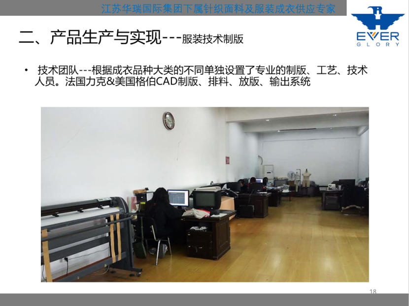 技术团队---根据成衣品种大类的不同单独设置了专业的制版、工艺、技术人员。法国力克&美国格伯CAD制版、排料、放版、输出系统